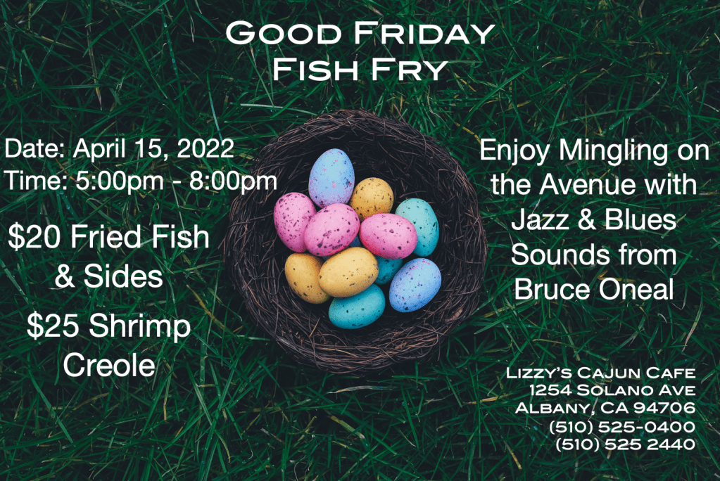 The first of our two events is our “Good Friday Fish Fry”. Join us on Friday, April 15, 2022, at Lizzy’s Cajun Cafe, located at 1254 Solano Avenue, Albany, CA 94706, for an evening of fried fish and cajun cuisine.