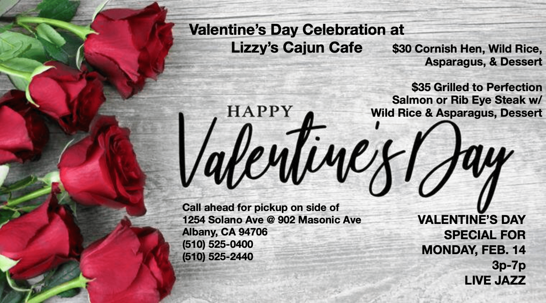 This February 14, 2022, enjoy Valentine’s Day at Lizzy’s Cajun Cafe! Located in Albany, CA, Lizzy’s will be offering our Valentine’s Day Special from 3PM to 7PM. Guests will be able to choose from two special offers: Cornish Hen, Wild Rice, Asparagus, and Dessert for $30Grilled to Perfection Salmon or Rib Eye Steak w/Wild Rice, …
